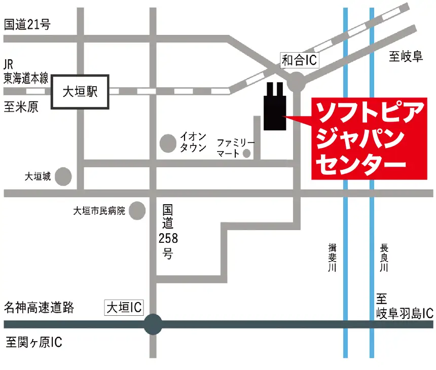 | 交通 | 【電車】 JR東海道本線 [大垣駅]から 車で約10分 名古屋〜大垣間 快速で約30分 【お車】 東名高速道路を利用する場合: 名神高速道路 [大垣I.C.]、[安八スマートI.C.]、[岐阜羽島I.C.]から 車で約20分 東海環状自動車道 大垣西I.C.から車で約20分 【バス】 バスで約15分(大垣駅南口3番乗車) 「ソフトピア線」および「羽島線(はしません)」 |