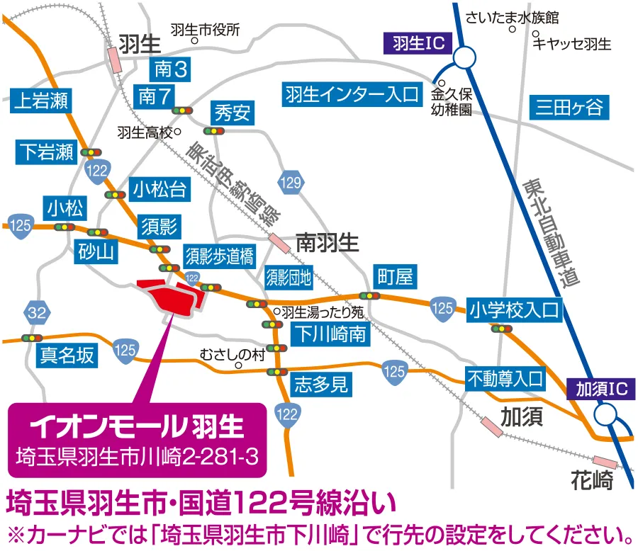 | 交通 | 【バス】 東武伊勢崎線「羽生駅(西口)」より約15分 (大人運賃片道200円/子供運賃片道100円) 【お車】 東北自動車道「羽生IC」より南西に約4.5km 東武伊勢崎線・秩父鉄道「羽生駅」より南に約3km ※カーナビは「埼玉県羽生市下川崎」で行先の設定をしてください。 |