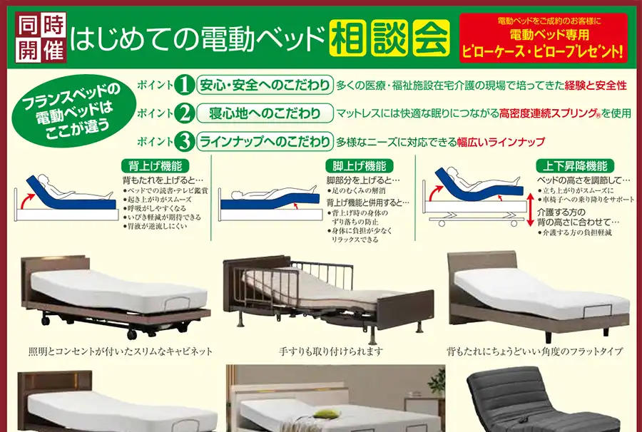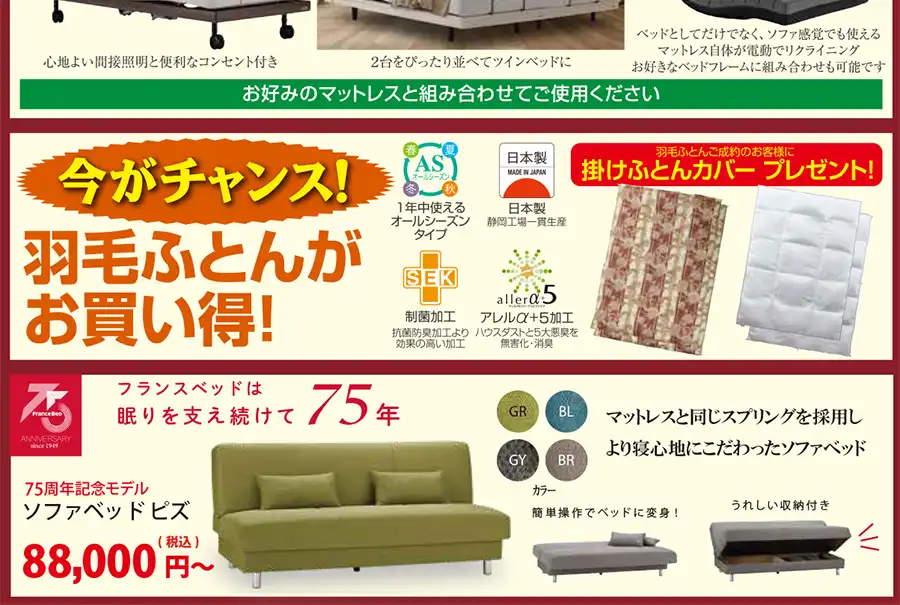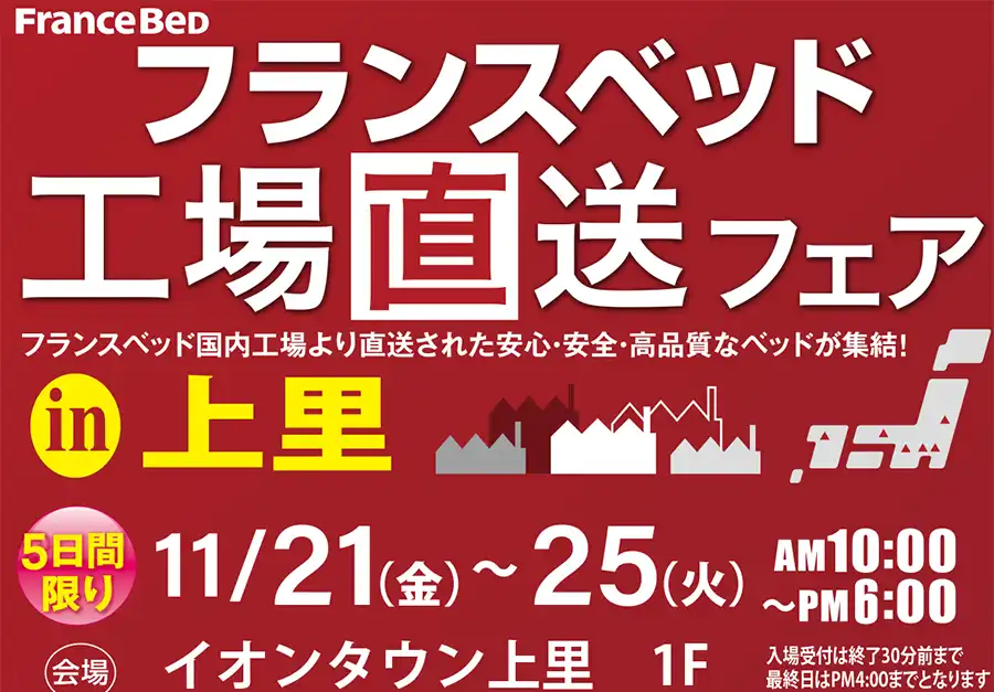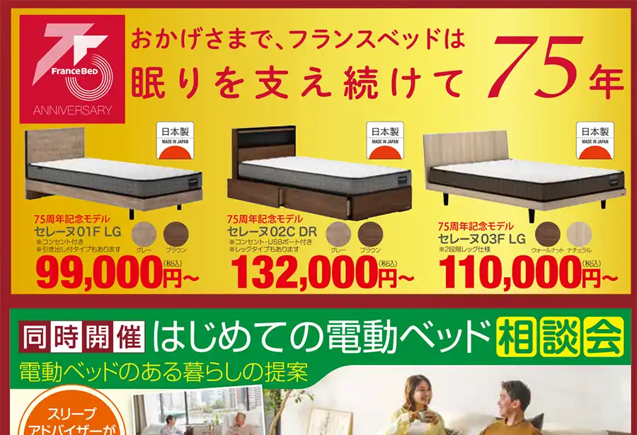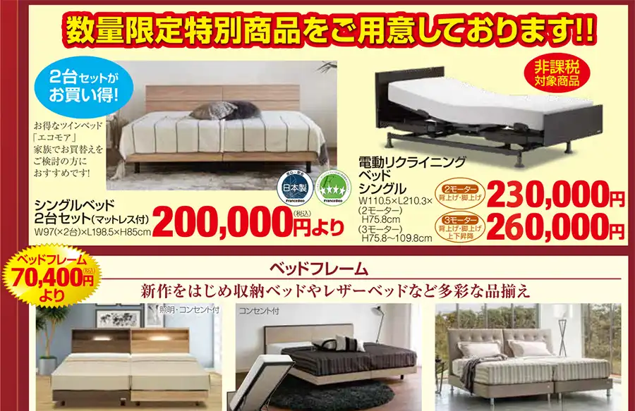 フランスベッド販売 関東支店 TEL042-443-0451 10:00~16:00(平日のみ) 期間中のみ直通 080-9172-6146(担当:吉澤) |