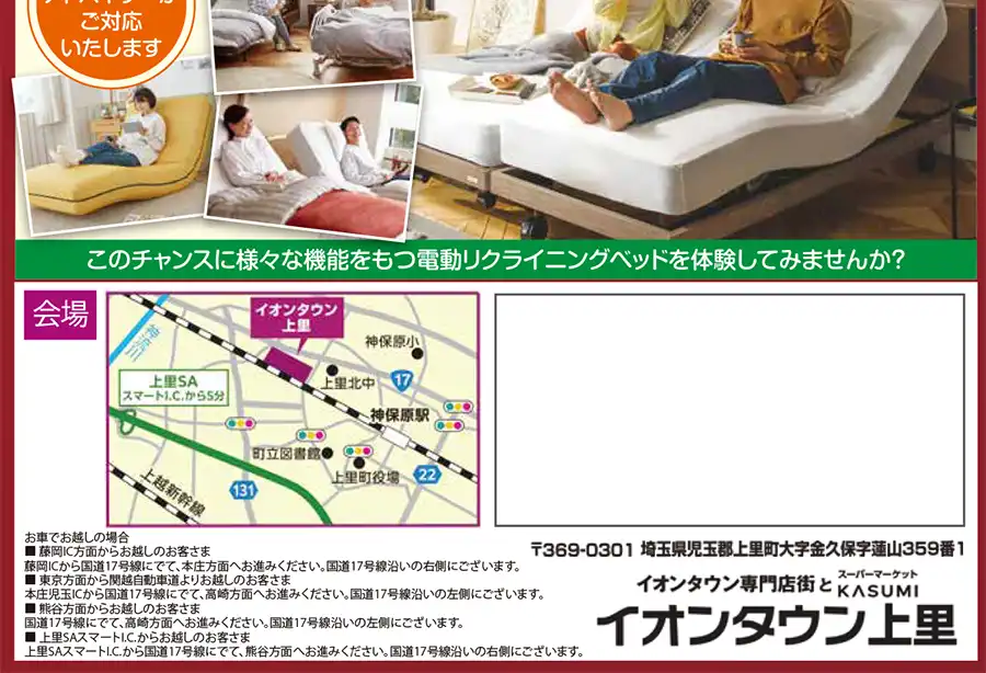 | 会場 | イオンタウン上里 1F 〒369-0301 埼玉県児玉郡上里町金久保字蓮山359-1 Googleマップ |