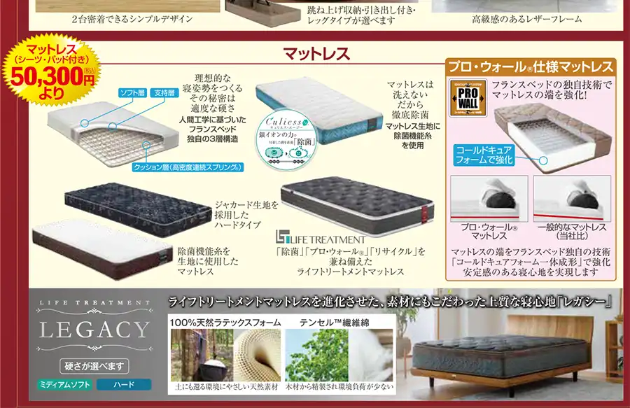【取扱い商品】ベッドフレーム、マットレス、電動リクライニングベッド、羽毛布団、寝装品(枕・カバー類)、LTシリーズほか