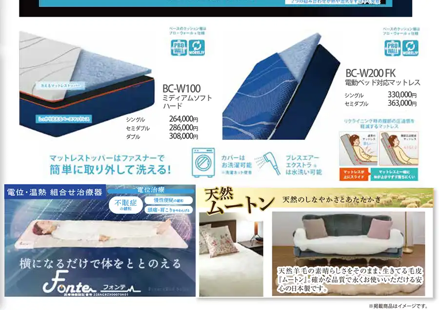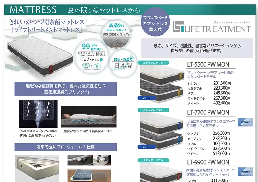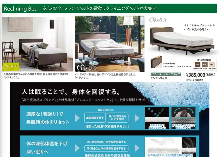 【取扱い商品】ベッドフレーム、マットレス、電動リクライニングベッド、ソファベッド、羽毛布団、寝装品(枕・カバー類)、LTシリーズ、スランバーランド、ラミダスほか
