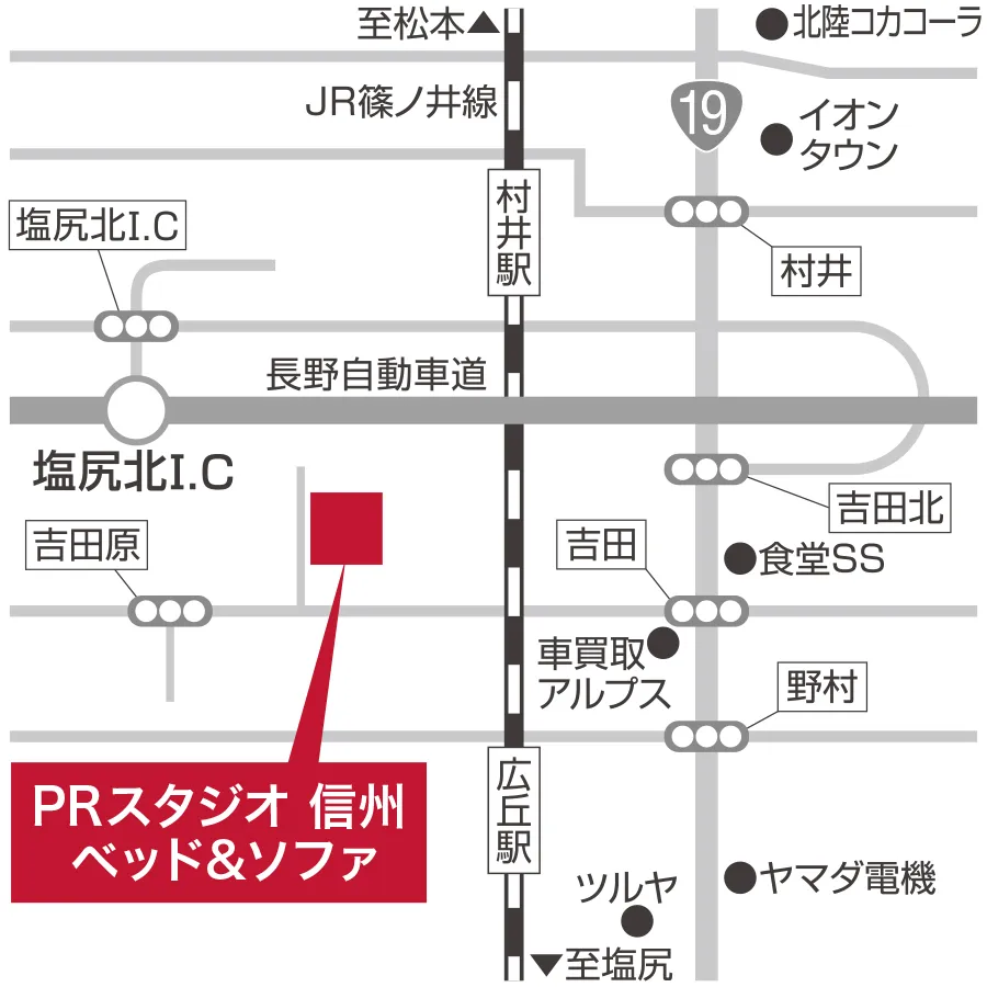 | 交通 | 【お車】 塩尻北ICより車で5分。国道19号線吉田交差点を西へ。JR線・踏切を渡りすぐ右側(旧マルヤ家具跡地) |
