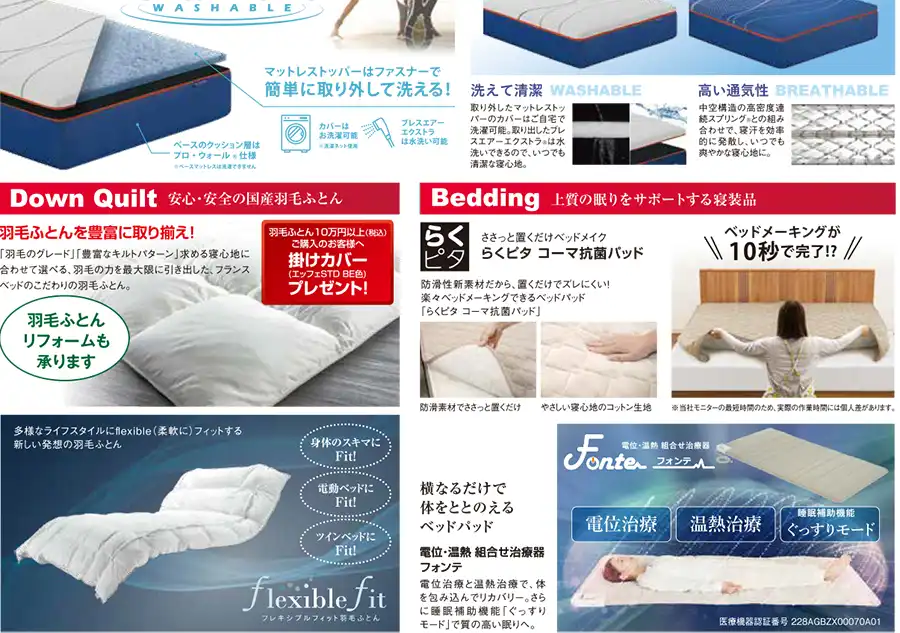 【取扱い商品】ベッドフレーム、マットレス、電動リクライニングベッド、ソファ、ソファベッド、羽毛布団、寝装品(枕・カバー類)、LTシリーズ、スランバーランド、ラミダスほか