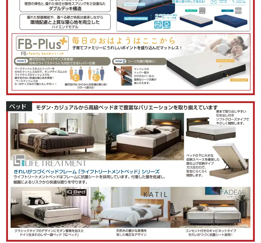 【取扱い商品】ベッドフレーム、マットレス、電動リクライニングベッド、ソファベッド、羽毛布団、寝装品(枕・カバー類)、LTシリーズ、ラミダスほか