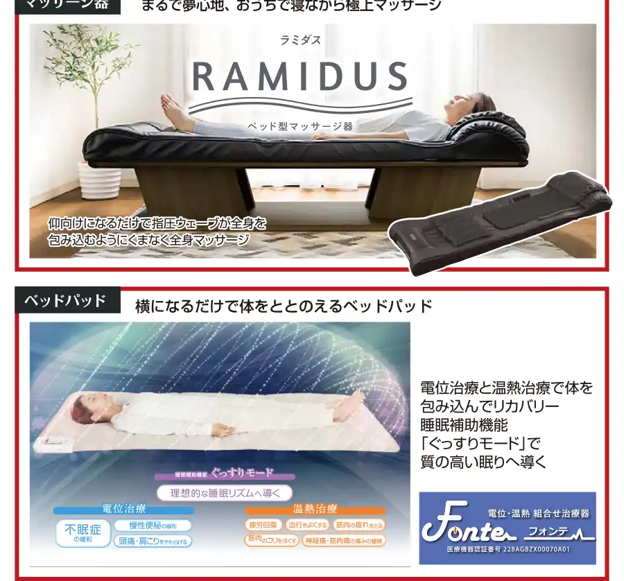 フランスベッド ベッド型マッサージ機ラミダスramidus 背伸び 医療機器認定 血行を良くする 肩凝り 筋肉をほぐす 胃腸の動きをよくする活発に 疲れを取る 温熱効果 温熱治療