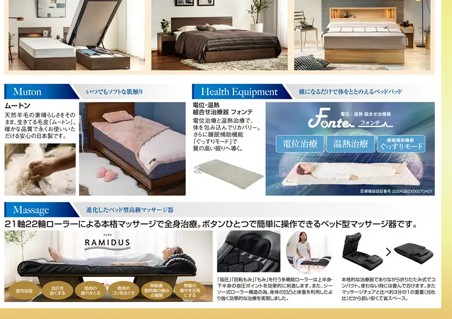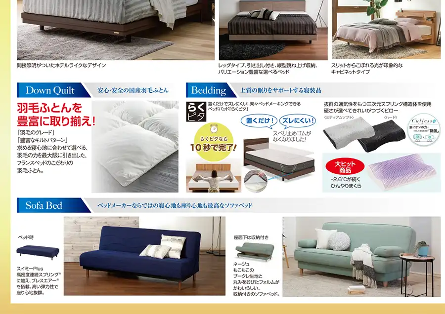 【取扱い商品】ベッドフレーム、マットレス、電動リクライニングベッド、ソファーベッド、羽毛布団、寝装品(枕・カバー類)、LTシリーズ、ラミダスほか