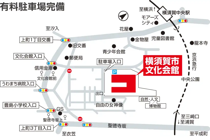 | 交通 | 【電車】 京急「横須賀中央」駅 西口改札を出て徒歩10分 JR横須賀線「横須賀」駅下車 京急バス乗車約10分 バス停「文化会館前」下車 徒歩3分 ※土・日・祝日は道路が大変混みあいます。ご注意ください。 【お車】 「横浜横須賀道路」横須賀IC経由本町山中有料道路終点より国道16号に沿って進み、本町一丁目交差点を右折。 そのまま直進し、Y字路を右折、横須賀中央駅横の坂を登る。道なりに進み、文化会館入り口の標識が出てきたら左折。 ※土・日・祝日は周辺道路が大変混みあいます。ご注意ください。 |